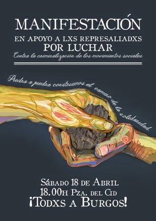 Desde hace semanas a través de distintos medios de contrainformación venimos informando de la manifestación convocada para este sábado 18 de abril en Burgos, en solidaridad con las personas represaliadas por luchar. Una iniciativa solidaria que dará comienzo a partir de las 18.00 horas desde la plaza del Cid y que tras la última oleada represiva contra los movimientos sociales en general y el movimiento libertario en particular se hace más necesaria que nunca.