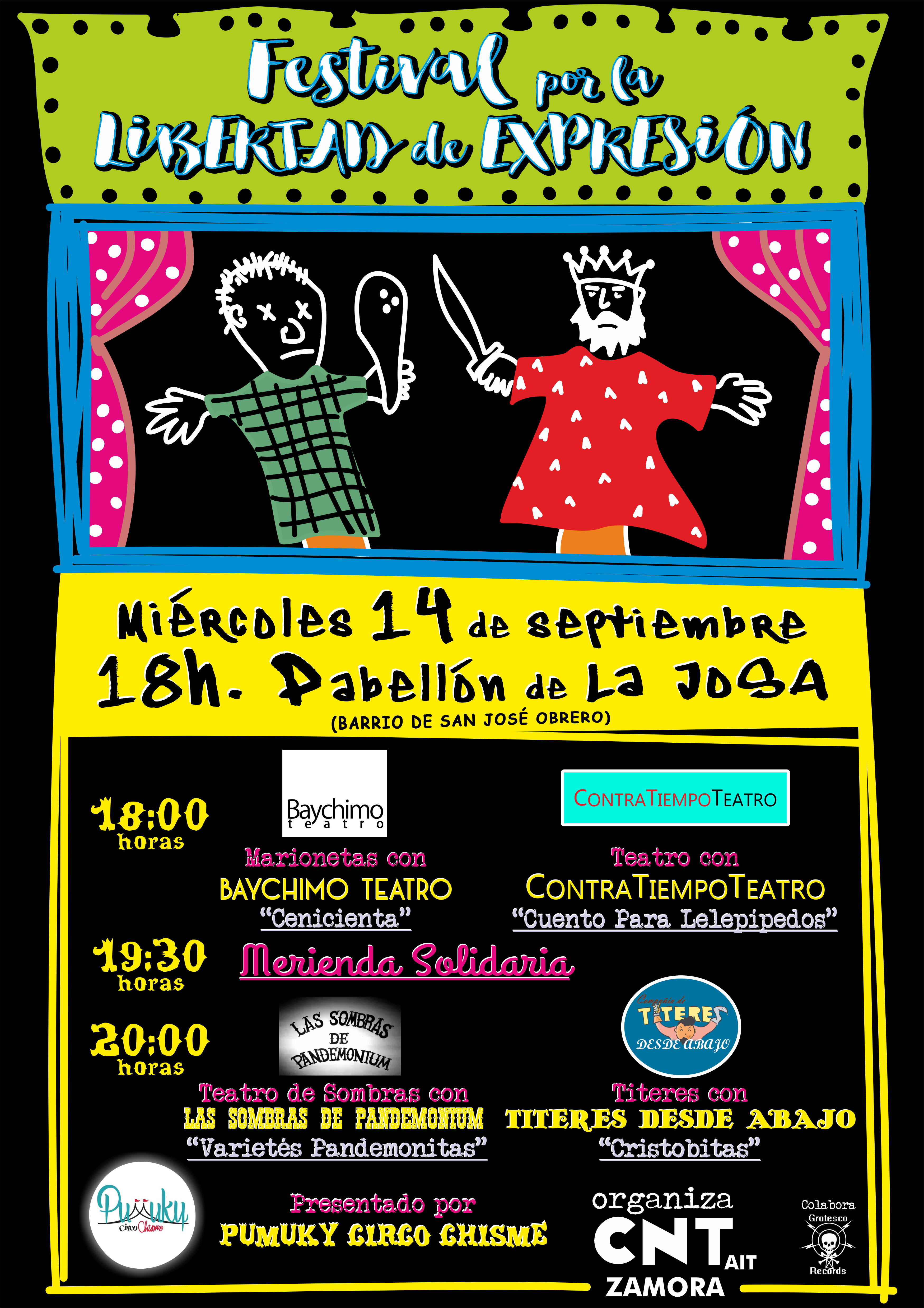 El miércoles 14 de septiembre a las 18h comienzan las Jornadas Libertarias otro año más. Comenzarán con el Festival por la Libertad de Expresión con la presencia de los ya famosos Títeres desde Abajo que harán una parada por nuestras tierras y los no menos famosos Baychimo Teatro, Contratiempo teatro y Las Sombras de Pandemonium y Pumuky como maestro de ceremonias
